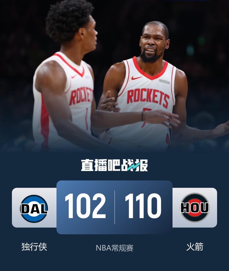 火箭力克独行侠 杜兰特&申京&阿门合砍74分 华盛顿空砍29+12